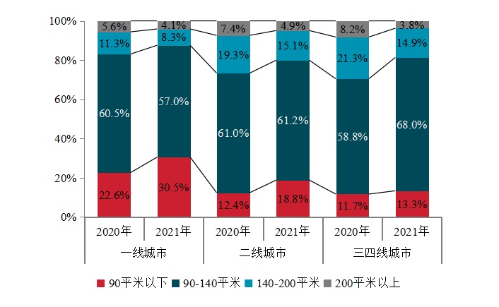 中国房地产101-200强代表企业2020、2021年分城市等级各面积段销售占比