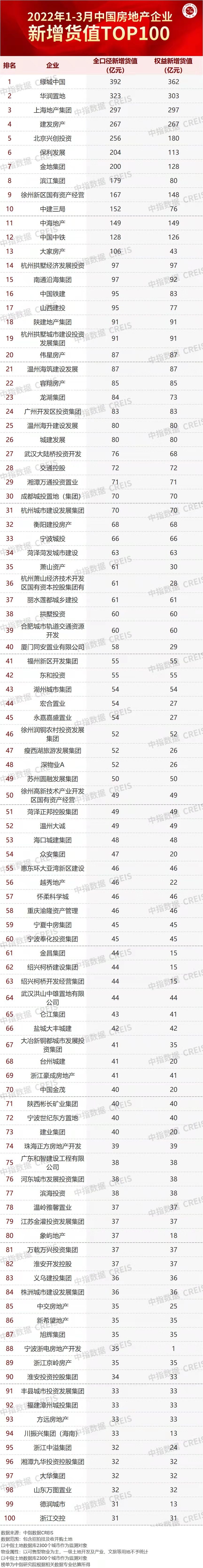 碧桂园、万科、保利发展、融创中国、中海地产、绿地控股(600606)、华润置地、招商蛇口(001979)、龙湖集团、金科集团、金地集团(600383)、新城控股(601155)、中国金茂、旭辉集团、绿城中国、龙光集团、中南置地、越秀地产、中国铁建(601186)、正荣集团、融信集团、新希望地产、雅居乐、美的置业、远洋集团、滨江集团(002244)、时代中国、祥生地产、华发股份(600325)、中骏集团、宝龙地产、金辉集团、禹洲集团、首开股份(600376)、合景泰富集团、华宇集团、大悦城(000031)控股、仁恒置地、佳源国际、建发房产、路劲集团、大华集团、中交房地产、保利置业、电建地产、俊发集团、联发集团、建业集团、东原集团、德信地产