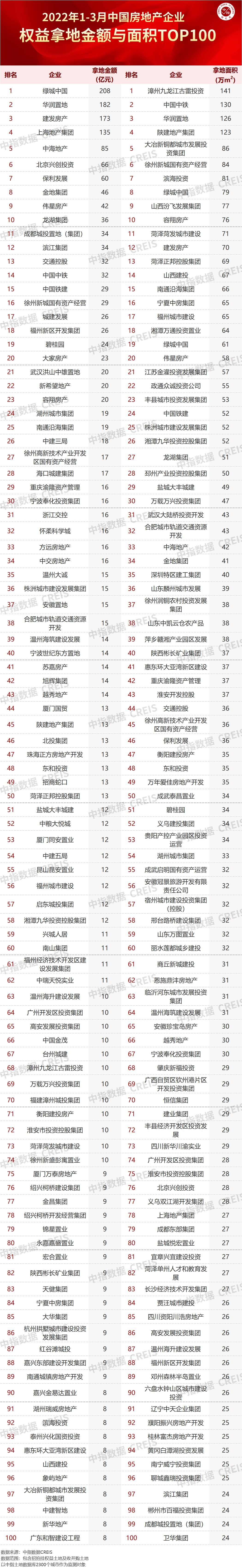 2022年1-3月,TOP100企业拿地总额2271.6亿元,拿地规模同比下降59.3%。TOP100门槛值为8亿元,较2021年3月下降6亿元,TOP100企业招拍挂权益拿地总额占全国300城土地出让金的比例为58.5%。