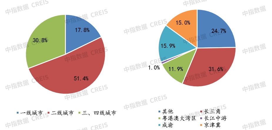 图:2022年1-3月50家代表房企拿地面积城市等级、区域分布情况
