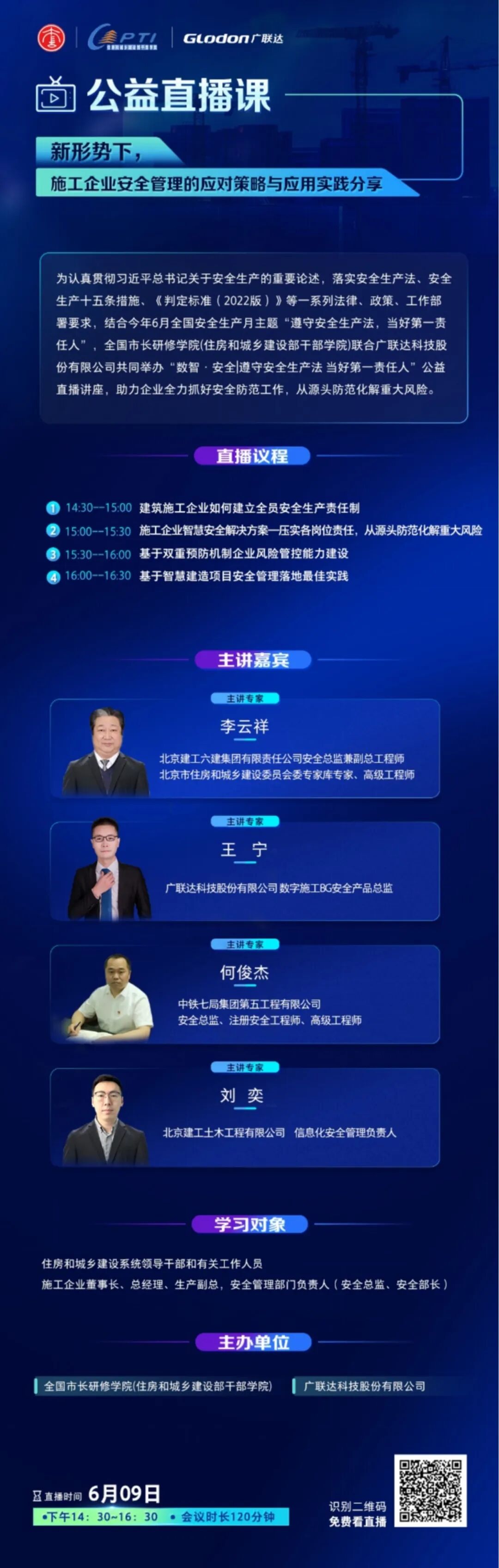 为指导帮助各地组织开展好2022年全国“安全生产月”活动,全国市长研修学院(住房和城乡建设部干部学院) 于6月9日(星期四)下午14:30—16:00举办第二期“数智·安全|遵守安全生产法 当好第一责任人—2022年安全生产政策解读和落地方案”网络公益直播。届时邀请北京建工六建集团安全总监兼副总工程师李云祥等4位专家做题为“施工企业安全管理的应对策略与应用实践”的网络公益直播课程,帮助住房和城乡建设系统领导干部和有关工作人员,施工企业董事长、总经理、生产副总,安全管理部门负责人(安全总监、安全部长)提升安全生产管理水平和业务技能。现就有关组织参加学习事项通知如下: