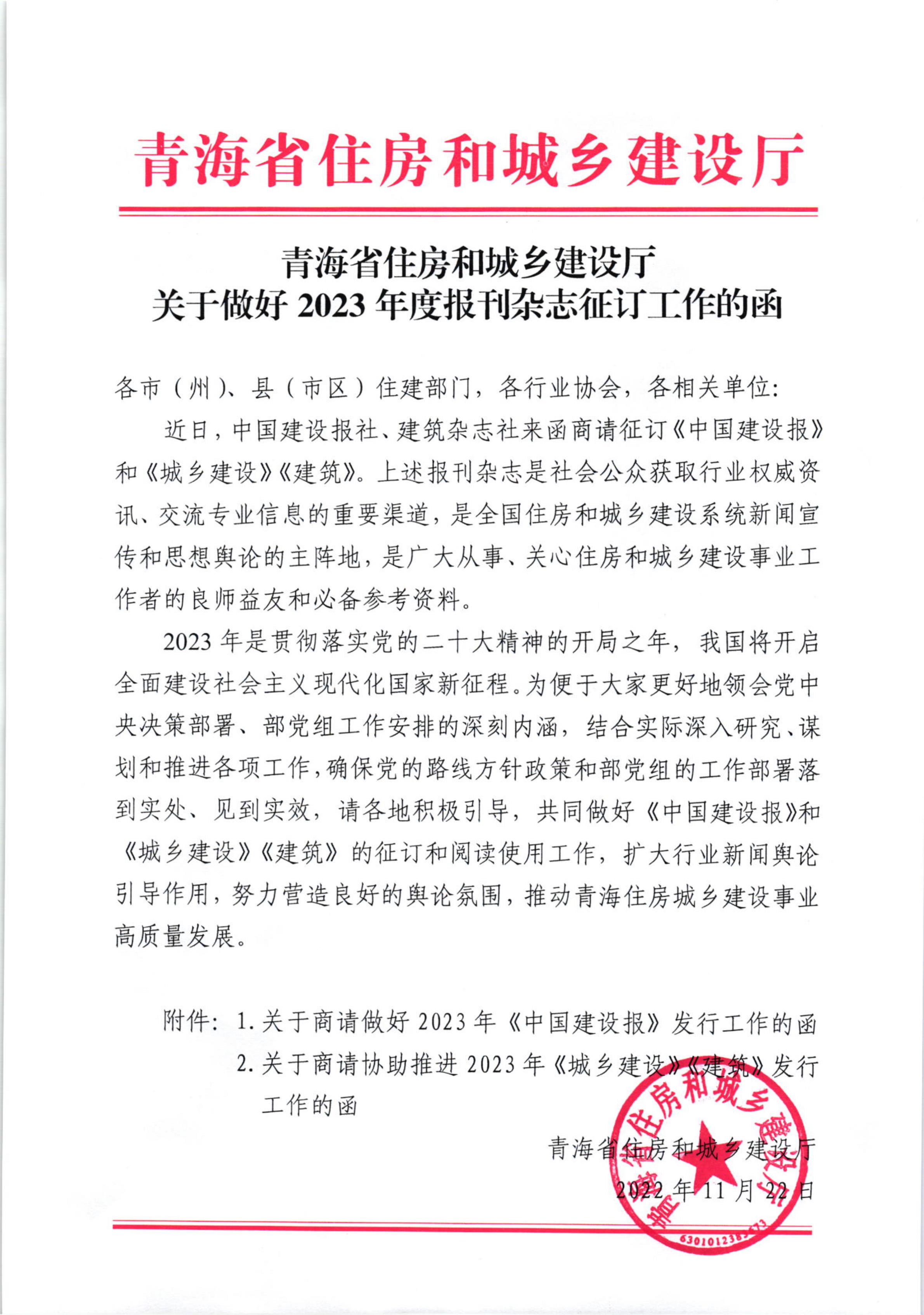 青海省住房和城乡建设厅关于做好2023年度报刊杂志征订工作的函
