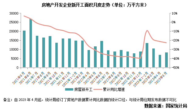 1—5月,全国房地产开发投资45701亿元,同比下降7.2%,降幅较1-4月扩大1个百分点,开发投资已经连续3个月下跌且跌速加快。单月来看,5月全国房地产开发投资额达10186亿元,同比下降10.5%,跌幅较1-4月扩大3.2个百分点,整体好于4月份,但绝对量依旧处在低位,较2022年月度投资平均值低14%。