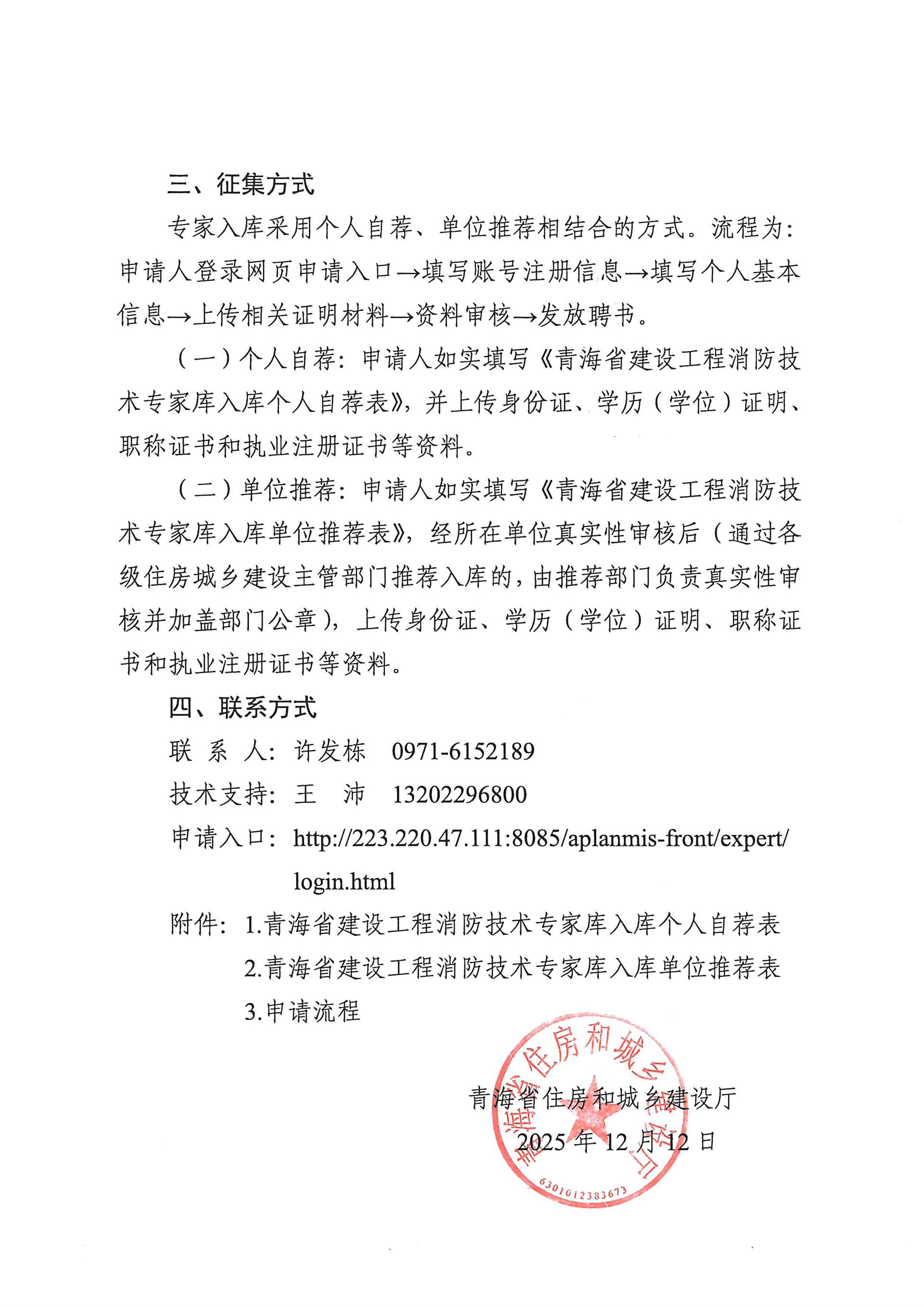 青海省住房和城乡建设厅关于公开征集建设工程消防技术专家库专家的通知