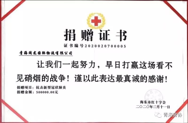 青海闽龙国际物流有限公司 向海东市红十字会捐款50万元。